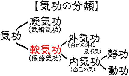 | その昔に人は体のどこかに痛みや異常を感じたとき、そっとそこに手を当てて、なでさする事で痛みを和らぐことを知ったり、また暖めたり、冷やしたり、押したりすることで尚、体が楽になることを経験的に知るようになりました。そして、このような経験を積み重ねて、針灸、指圧、マッサージ等が考案されるようになりました。何千年もの奥深い時間と幅広い人々がつくりだした傑作に他なりません。 そうした中の一つが太極拳、ヨガ等といった養生法であり気功もそのひとつです。 気功は導引、吐納とも呼ばれることもあり、多くの流派もあります。その中には武術気功といわれる格闘等の鍛錬法になったり、養生のための医療気功といわれる鍛錬法があります。